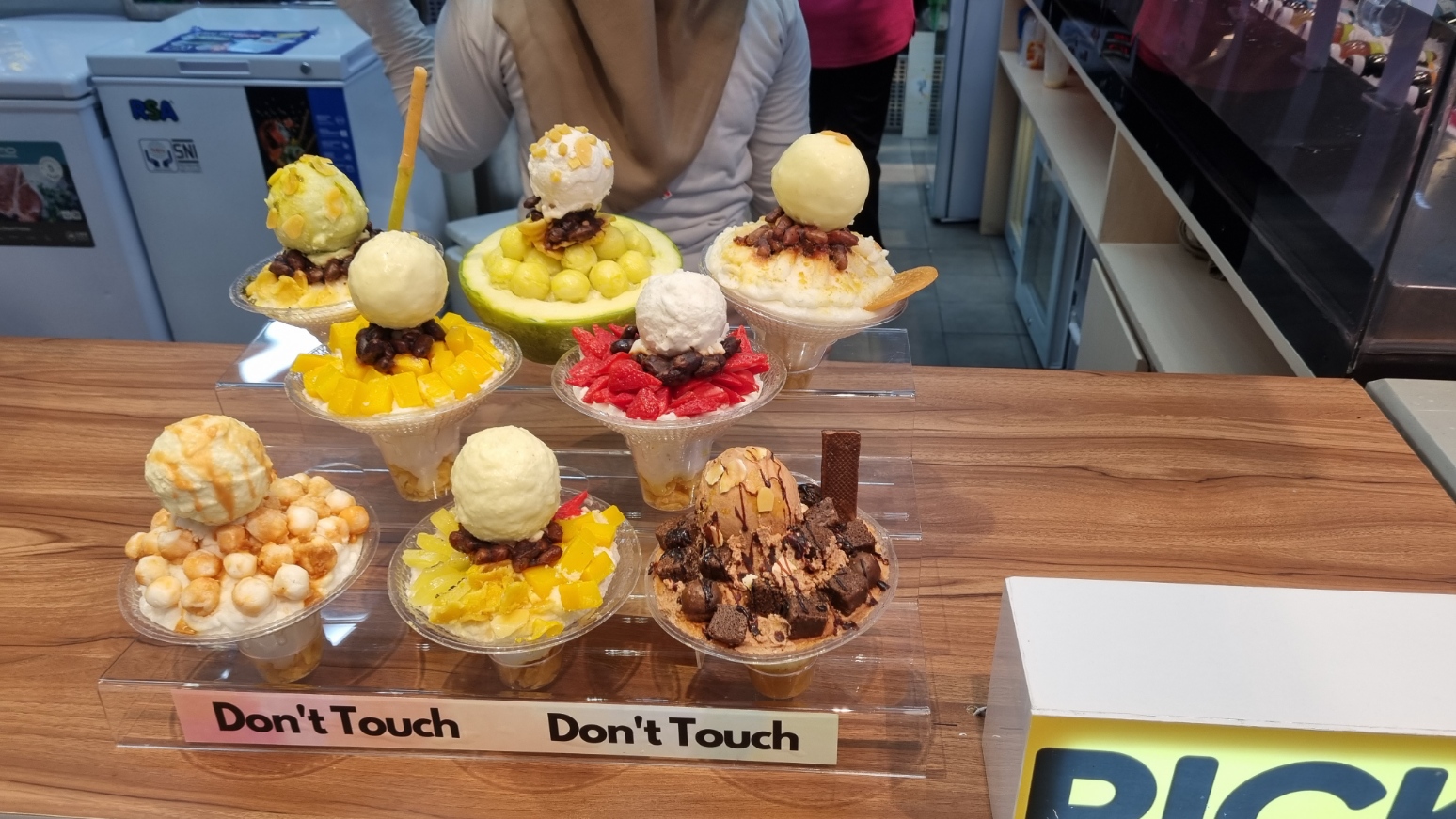 옆에는 다양한 빙수 모형이 있는데, 정말 맛있어 보입니다.
